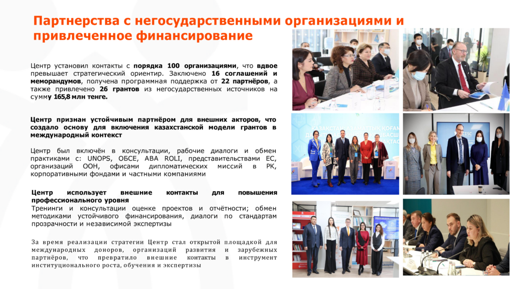 Таким образом, по итогам исполнения Стратегии развития Центра на 2020–2024 годы отмечается её успешная реализация. Реализация стратегии позволила Центру укрепить институциональные основы гражданского общества, повысить прозрачность и эффективность деятельности, расширить партнёрскую сеть и заложить прочную основу для дальнейшего развития в новом стратегическом периоде.